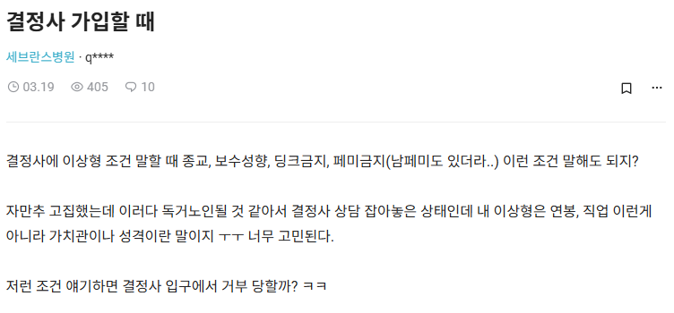 이 글을 읽은 분들은 스스로의 조건에 대한 메타인지가 이루어진 상태라고 생각합니다. 만약 이전 글을 읽지 못하셨다면 이 글을 읽고 오시는 것을 추천합니다. [결정사 성혼하는법 기본] 5. 결혼정보회사 상담 전, 조건 메타인지 하기이제 결혼정보회사의 기본적인 운영구조와 어떤 사람들이 결혼정보회사에 가면 안되는지를 알아보았습니다. 원래는 '결혼정보회사에 가면 의외로 좋은 사람들' 편을 작성하려 했지만, 어차피lovetalkbbobo.com이제 당신은 모 결혼정보회사에 상담 전화를 걸었고, 상담 매니저분과 미팅 약속도 잡은 상태입니다. 하지만 정작 상담에 가서 어떤 이야기를 해야 할지는 감이 안잡히죠. 아래 사례들은 인터넷에서 찾은, 대부분의 여러분처럼 감을 잡지 못한 사례들입니다.  이 분은 연봉, 직업이 ..